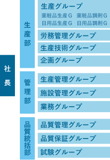 医薬品や医薬部外品、健康食品、芳香剤、家庭雑貨品等の原液・原薬を作る薬粧品調剤グループならびに日用品調剤グループ。またそれらの充填、包装をおこなう薬粧品生産グループならびに日用品生産グループ。生産ラインにて、容器供給や検品を実施する労務管理グループがあります。
